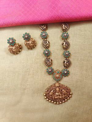 Srilakshya – Handmade Terracotta Lakshmi Pendant Necklace Set with Peacock Motifs and Teal Floral Accents