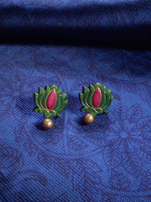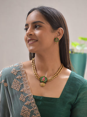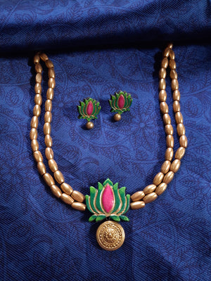Terracotta Antique Gold Beaded Necklace Set with Lotus Motif Pendant