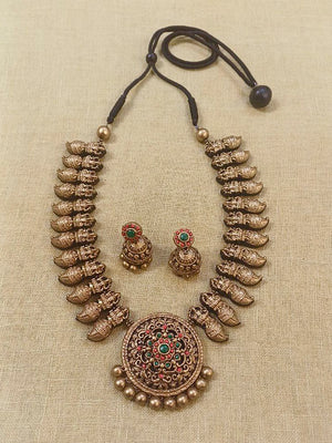 Terracotta Antique Gold Coin Necklace with Round Floral Pendant & Jhumka Earrings