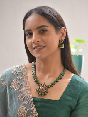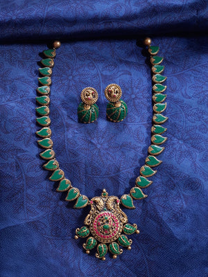 Terracotta Antique Gold Leaf Motif Necklace Set with Peacock Pendant