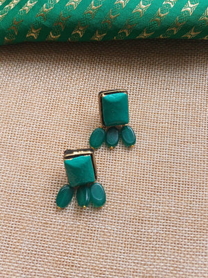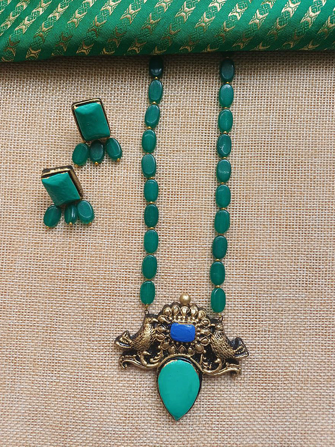 Terracotta Antique Gold Long Necklace Set with Green Beads & Dual Stone Pendant