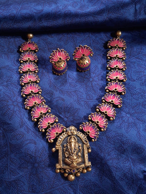 Terracotta Antique Gold Lotus Necklace Set with Ganesha Pendant
