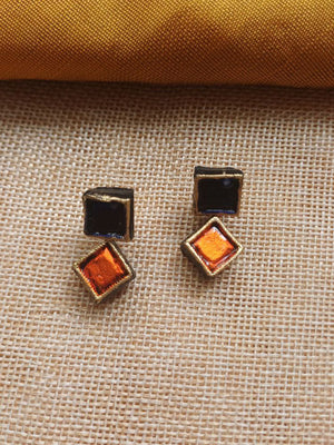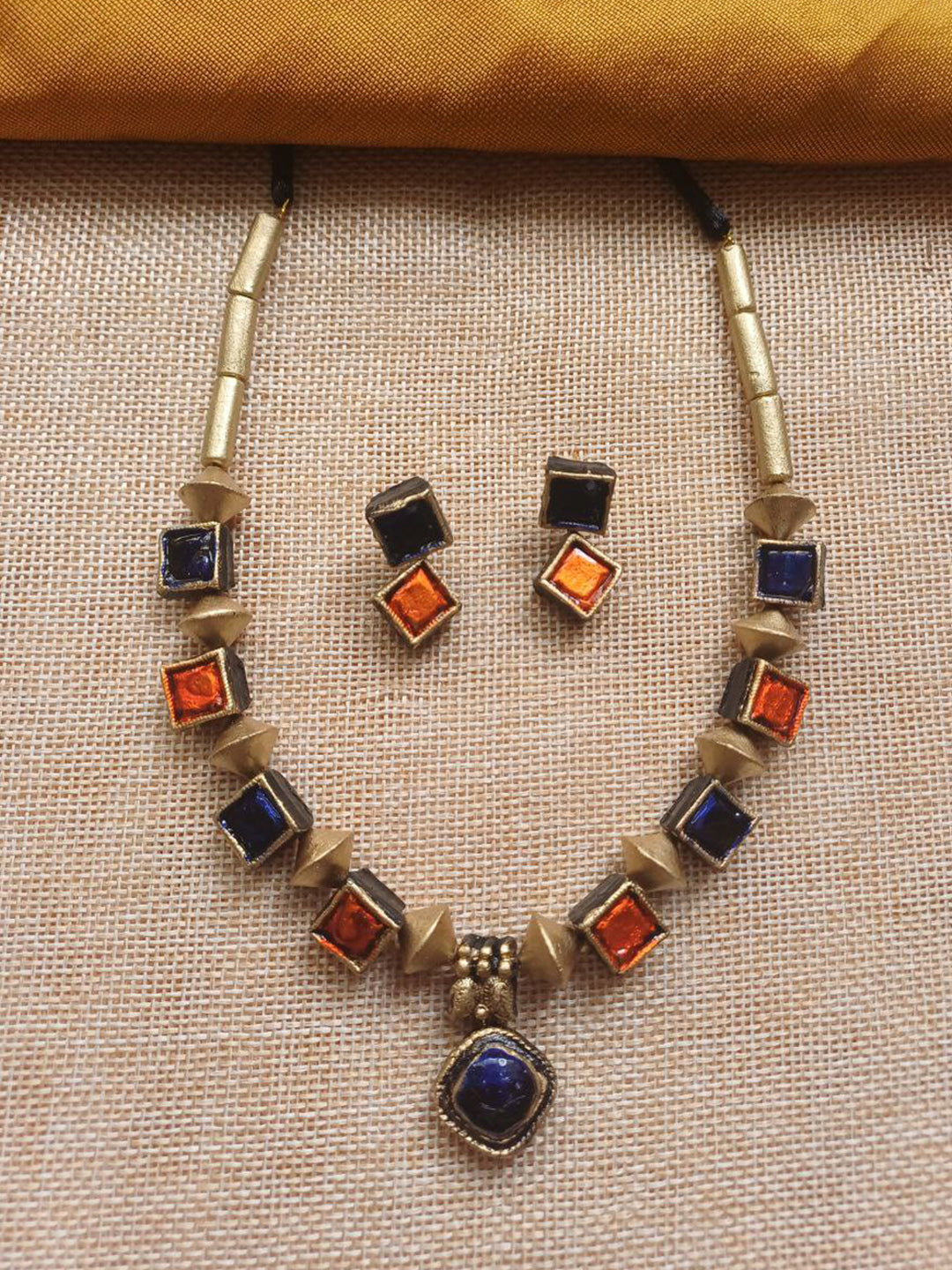 Terracotta Antique Gold Necklace Set with Blue & Amber Square Stones