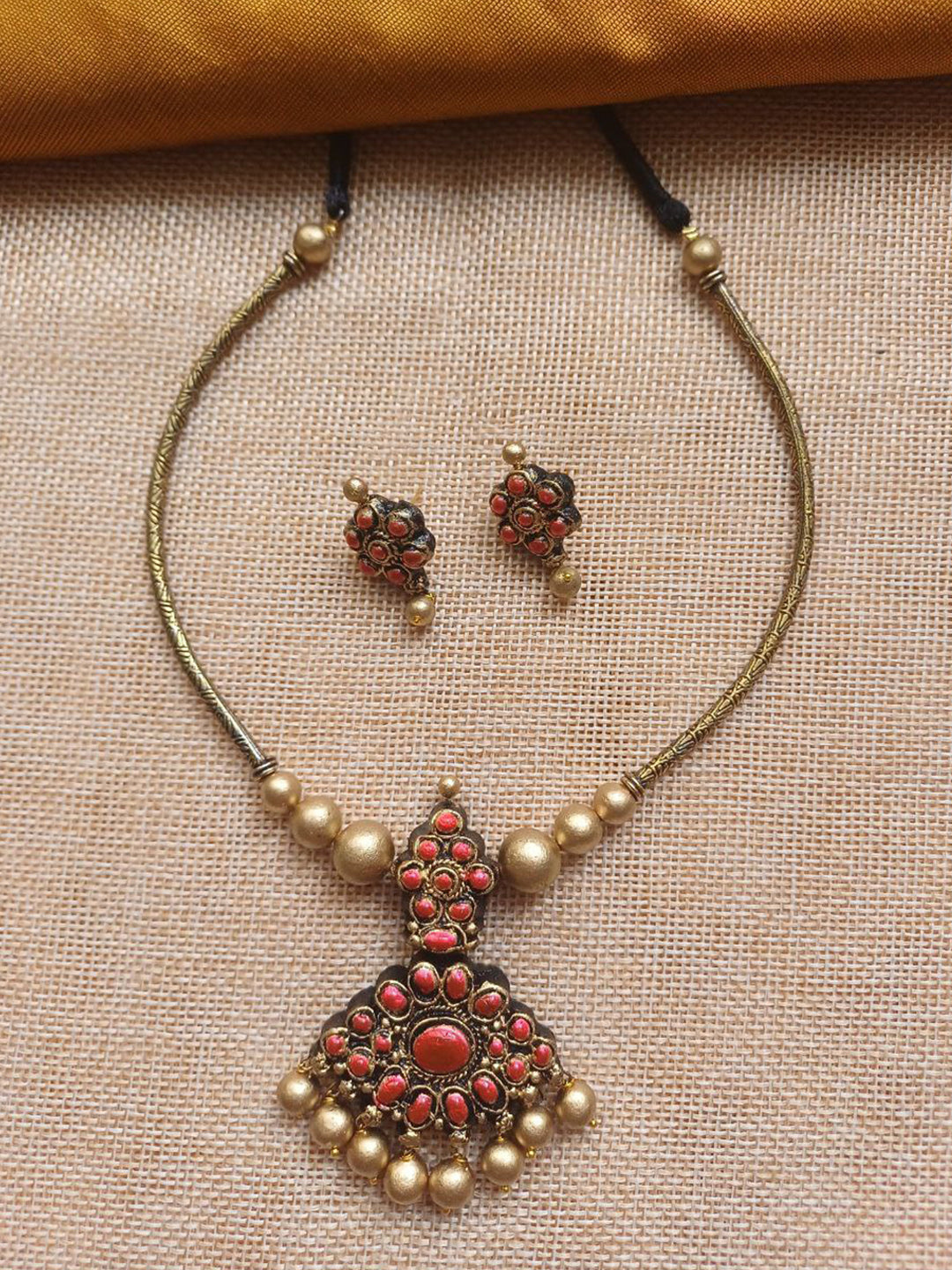Terracotta Antique Gold Necklace Set with Red Stone Design Pendant & Pearl Drops