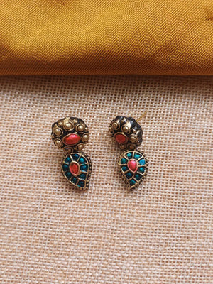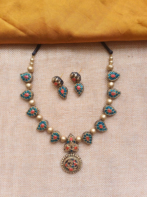 Terracotta Antique Gold Peacock Motif Necklace Set with Turquoise & Red Stones Design