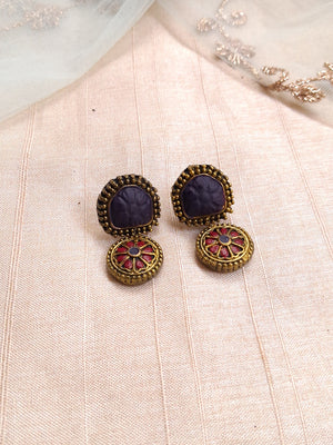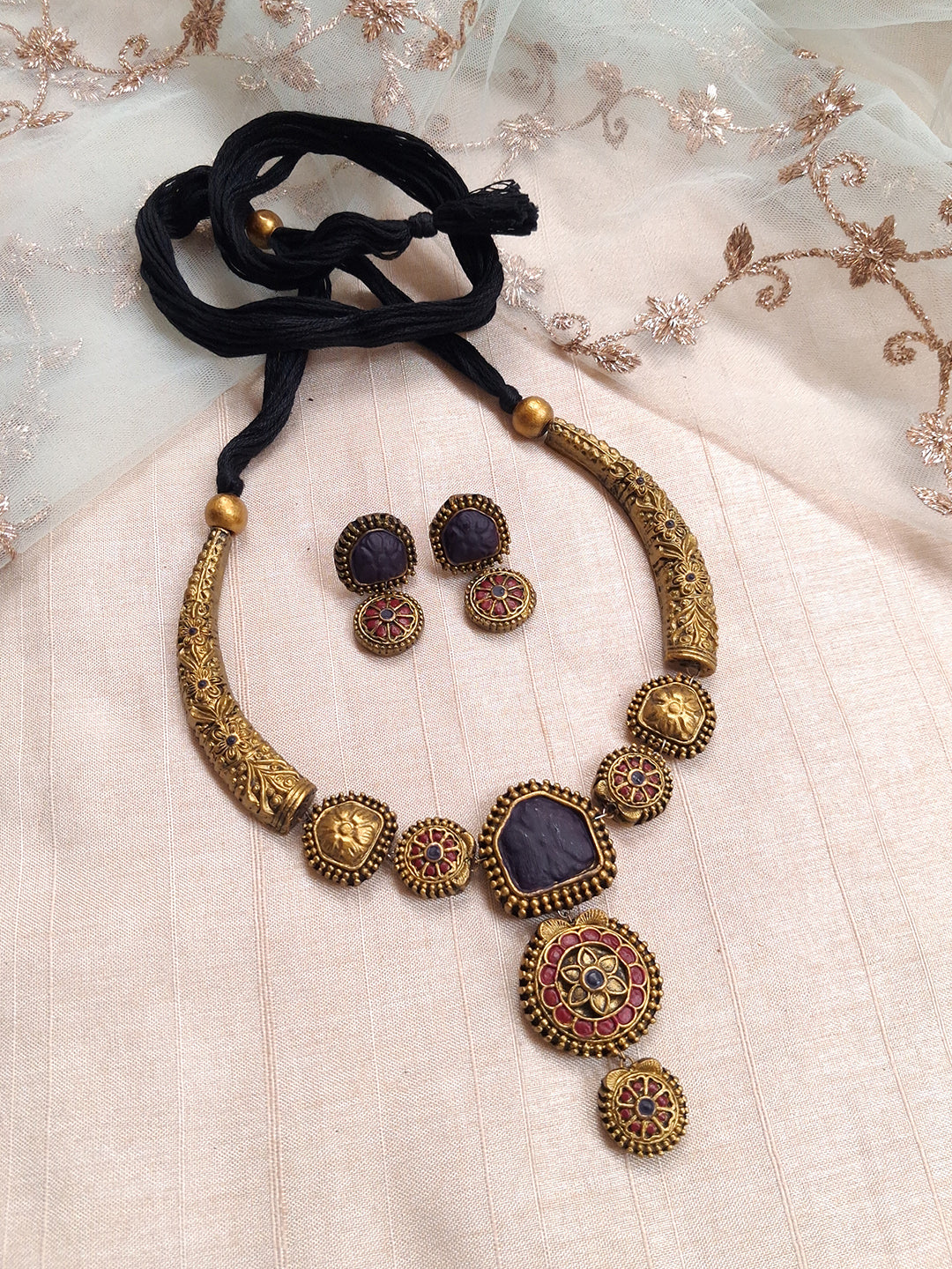 Terracotta Antique Gold Temple Choker with Purple Center Stone & Floral Drop Pendant