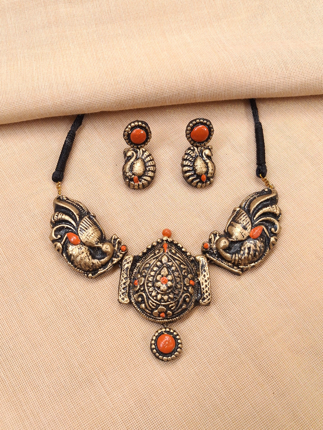 Terracotta Antique Peacock Crest Necklace Set With Jhumkas