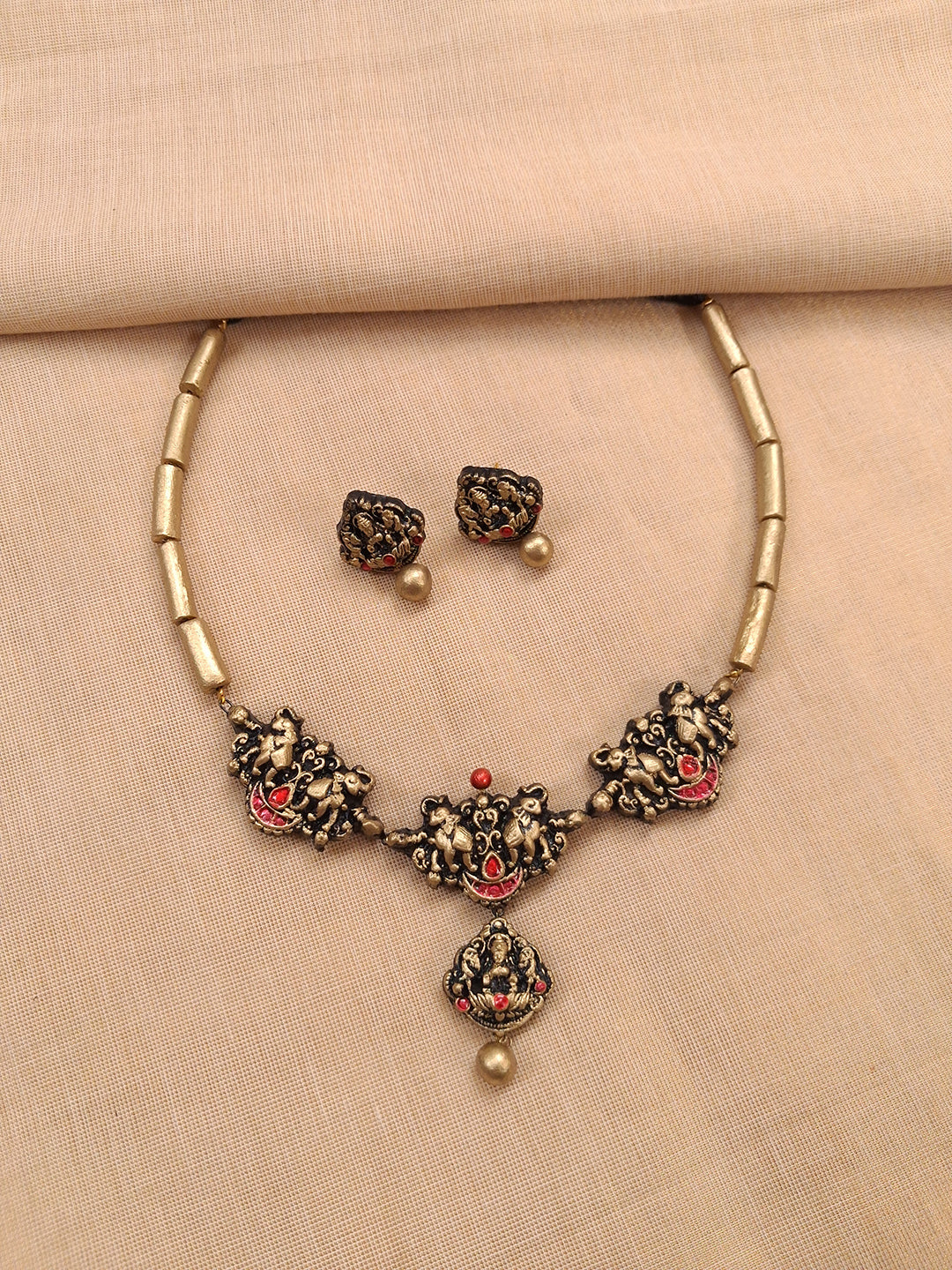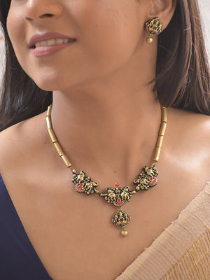 Terracotta Antique Twin-Elephant Temple Necklace Set With Studs