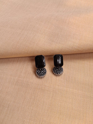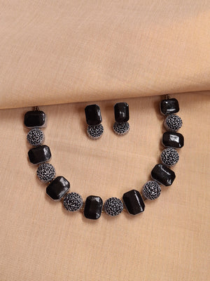 Terracotta Black and White Beaded Necklace with Floral Motifs and Matching Earrings