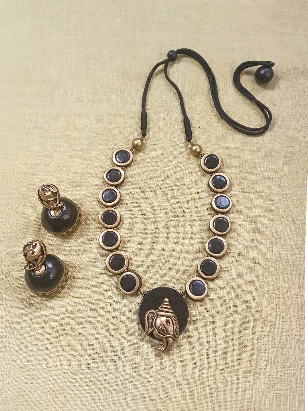 Terracotta Black Round Bead Necklace with Ganesha Pendant & Jhumka Earrings