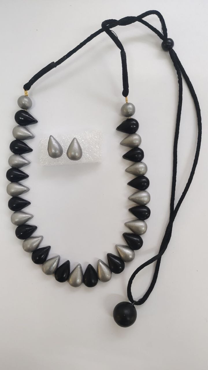 Terracotta Black & Silver Teardrop Bead Necklace Set