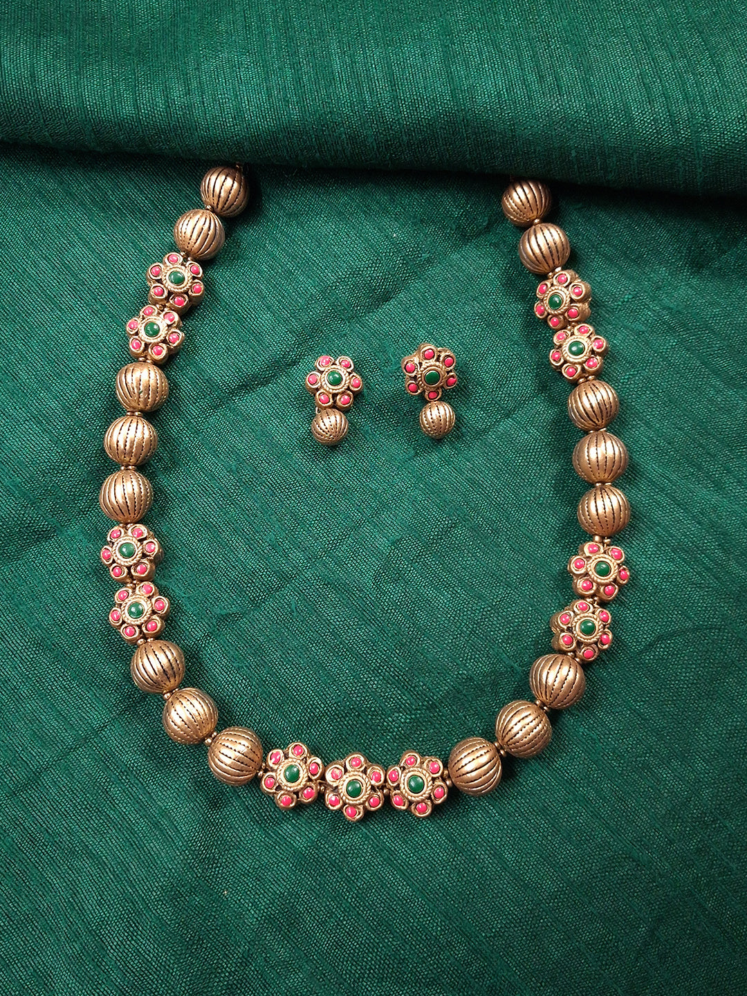 Home Terracotta Blossom Bead Necklace Set With Floral Studs