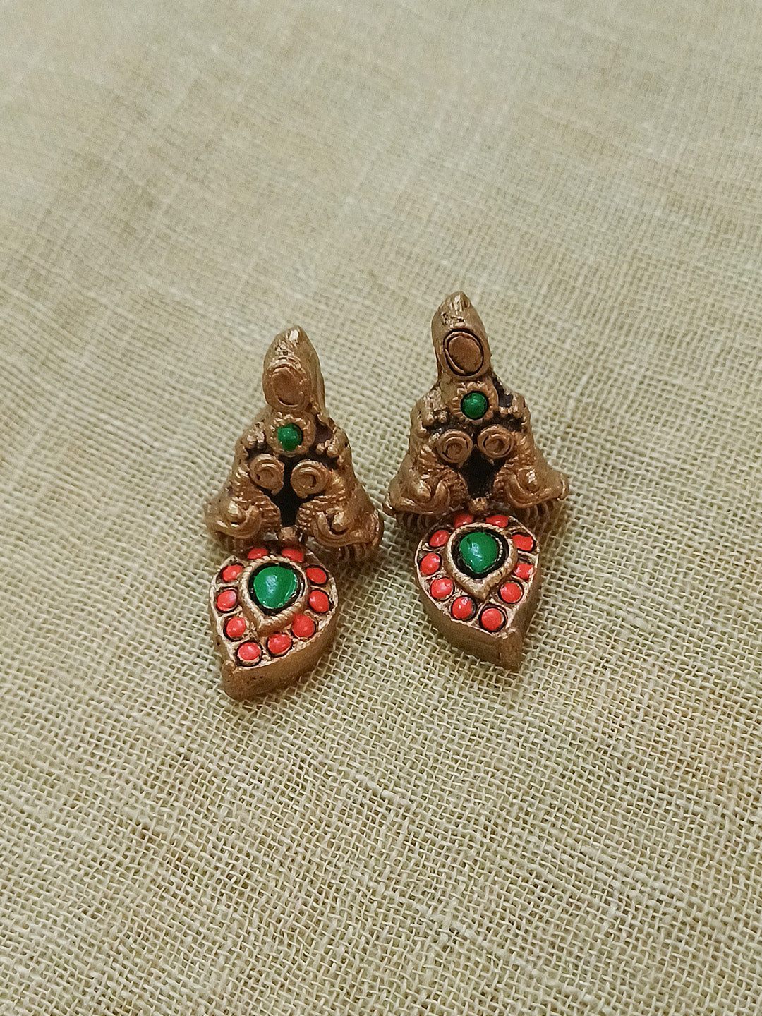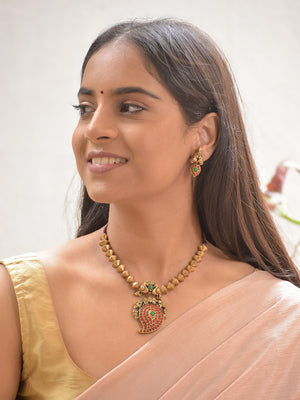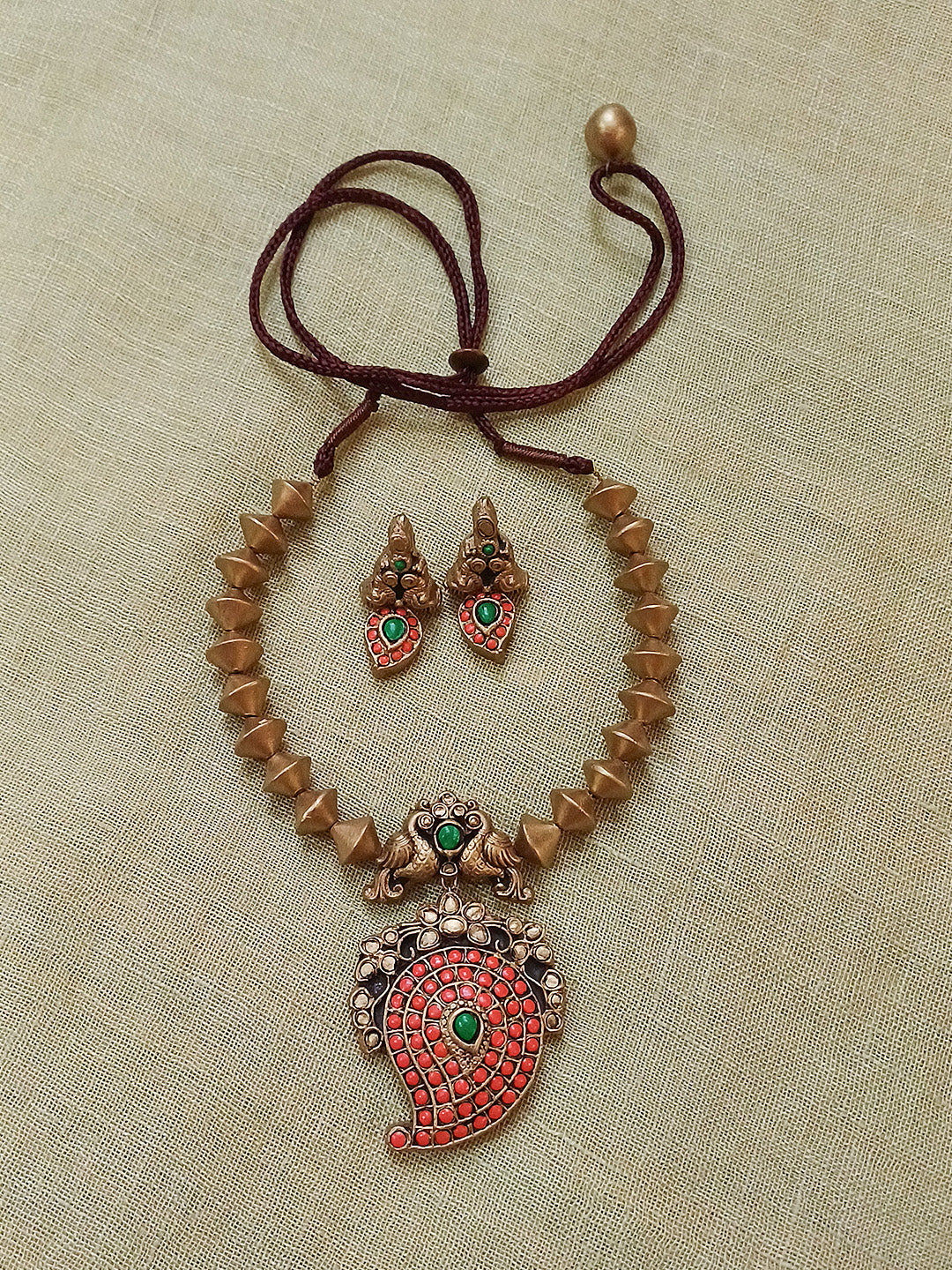 Terracotta Cone Bead Necklace with Peacock Motif & Red-Green Paisley Pendant