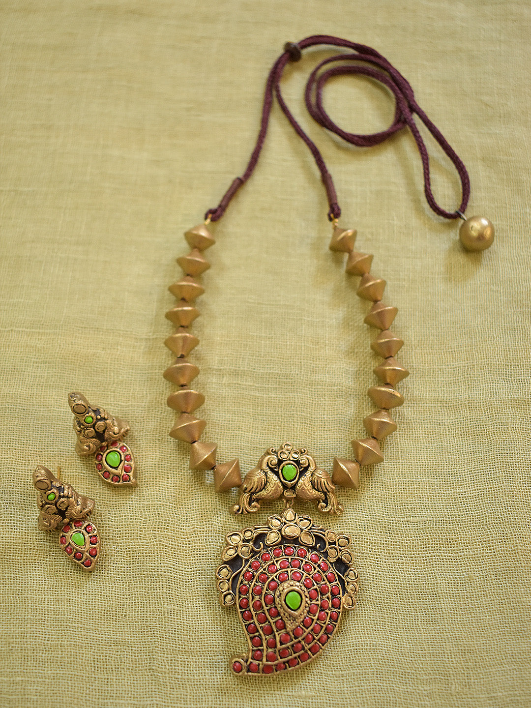 Terracotta Cone Bead Necklace with Peacock Motif & Red Paisley Pendant