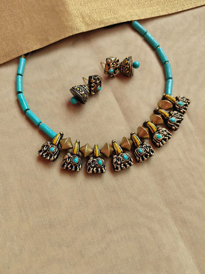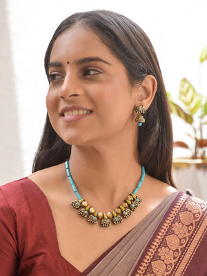 Home Terracotta Cylindrical Beaded Necklace with Gold Floral Motifs & Matching Earrings