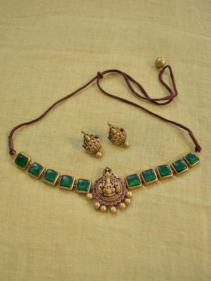 Home Terracotta Dark Green Square Stone Choker Necklace with Lakshmi Goddess Pendant & Earrings