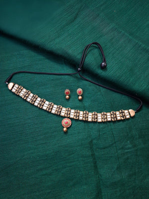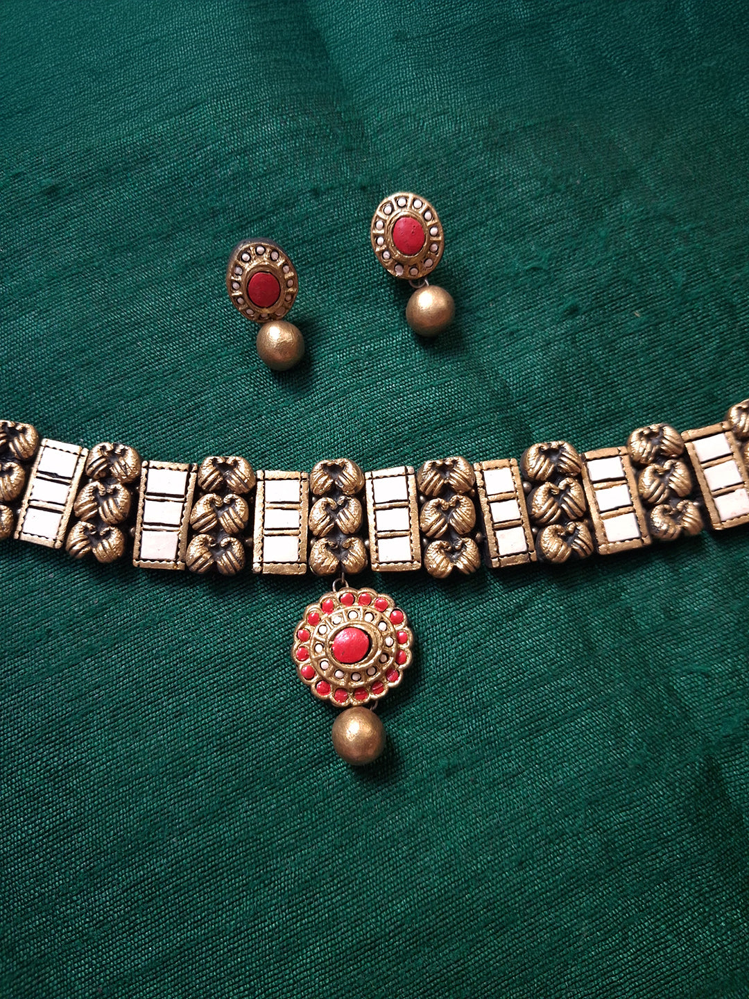 Rakta Pushpa Kanta — Terracotta Floral Block Choker with Red Medallion Pendant With Studs