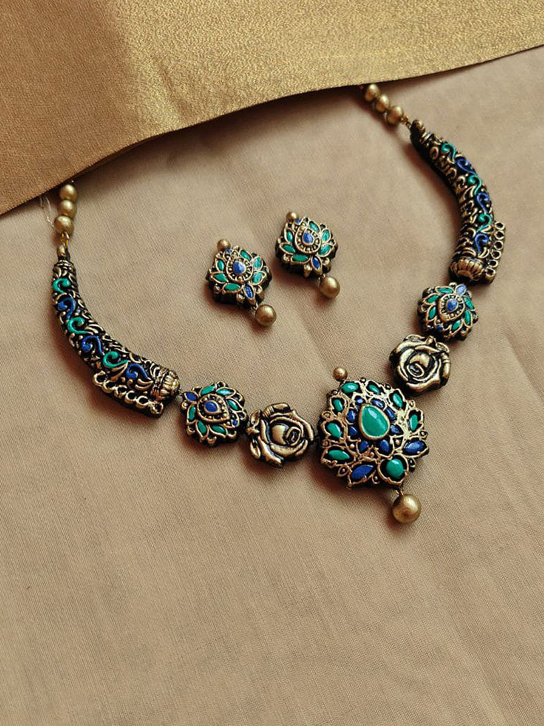 Terracotta Floral Motif Necklace Set with Blue-Green Accents