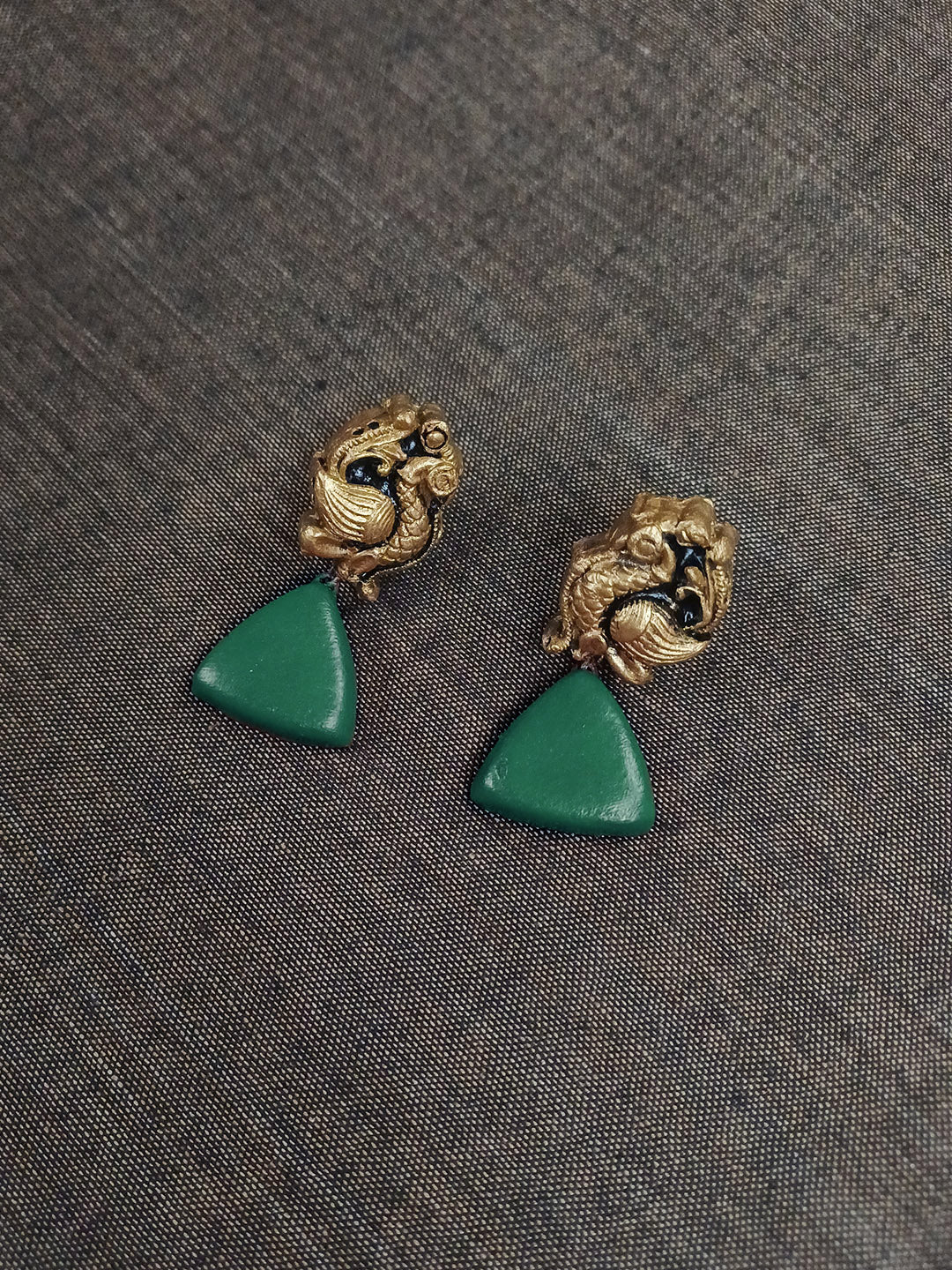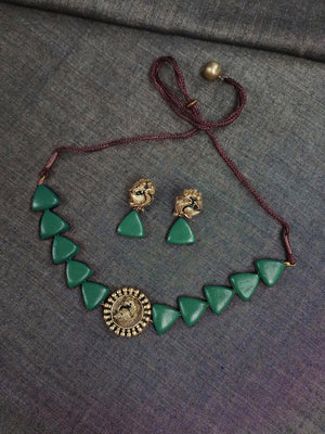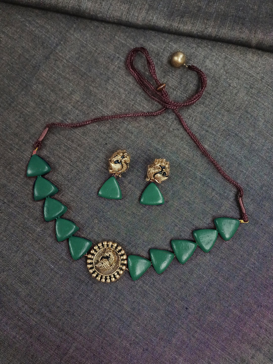 Terracotta Green Triangular Beads Peacock Pendant Necklace with Earrings