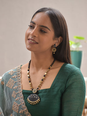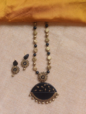 Terracotta Handpainted Black Pendant Necklace Set with Floral Motif