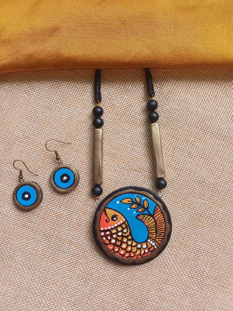 Home Terracotta Handpainted Fish Motif Pendant Necklace Set