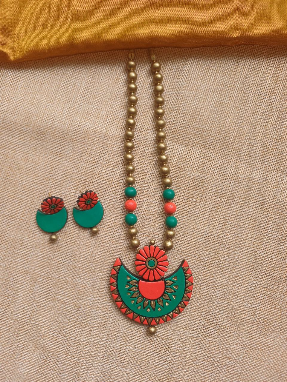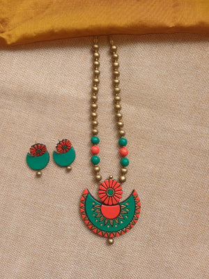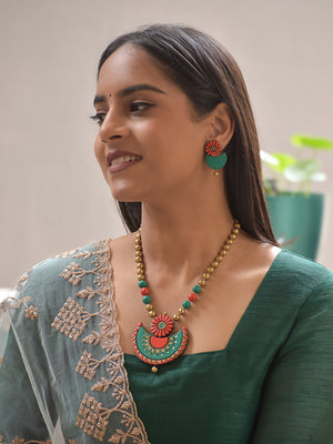 Terracotta Handpainted Floral Crescent Necklace Set in Green & Coral