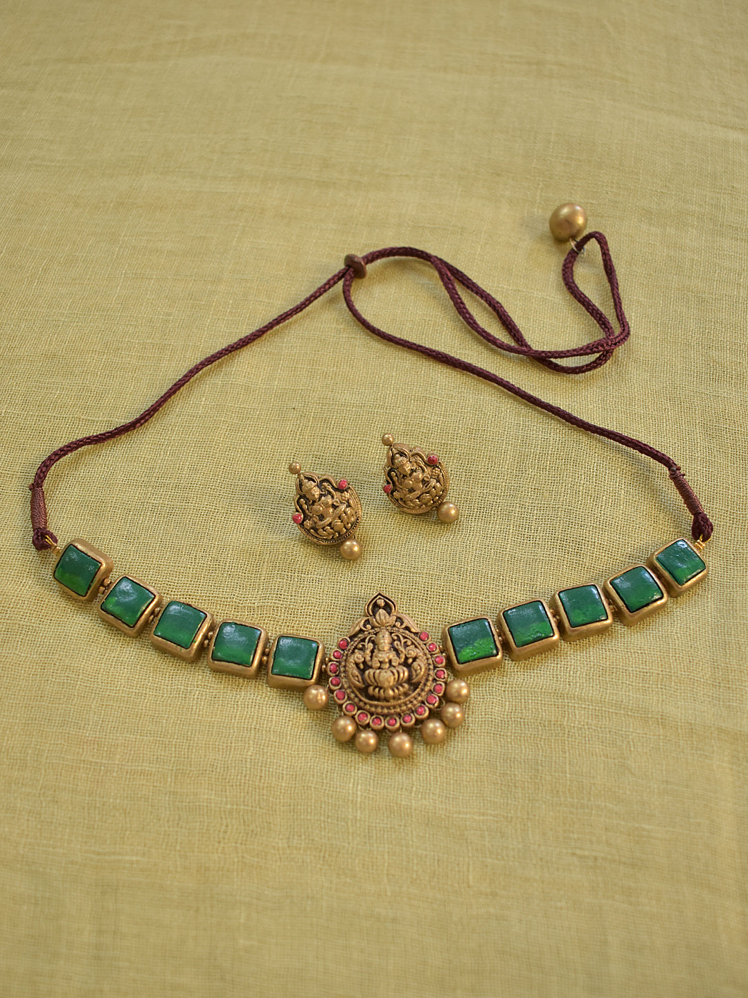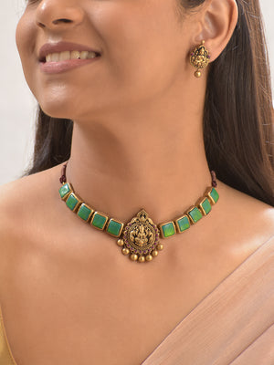 Terracotta Light Green Square Stone Choker Necklace with Lakshmi Goddess Pendant & Earrings