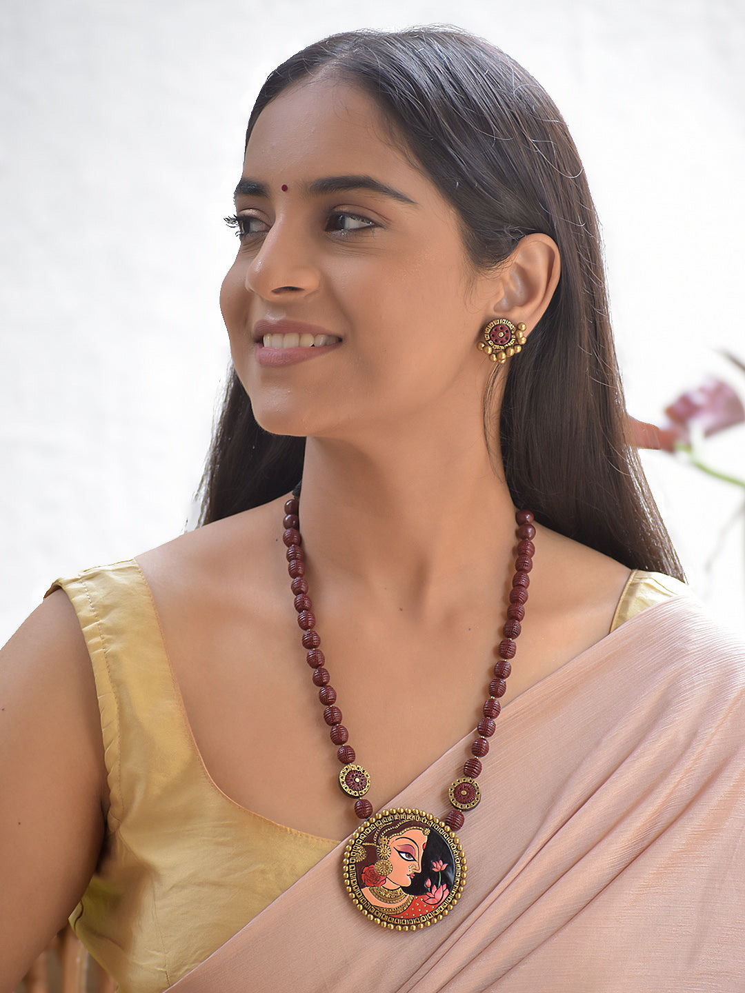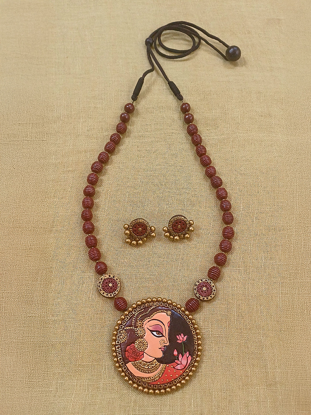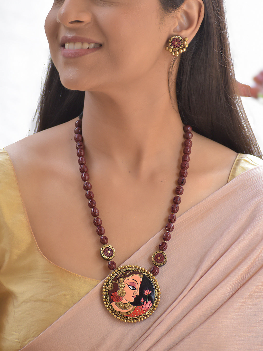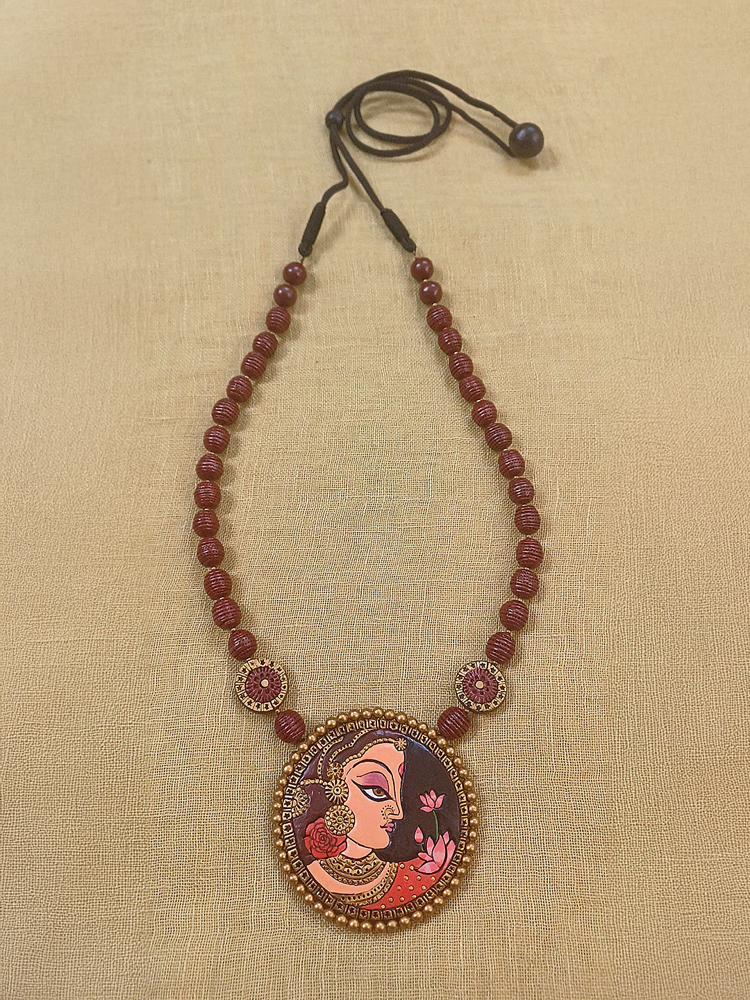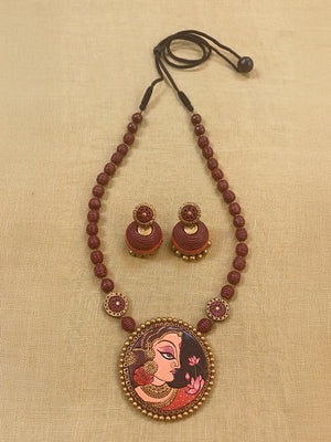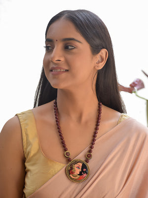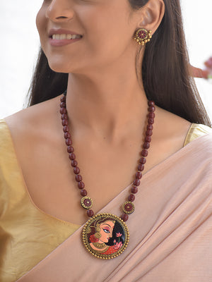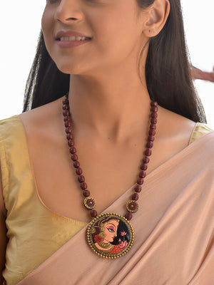 Terracotta Maroon Beaded Necklace with Hand-Painted Women Pendant