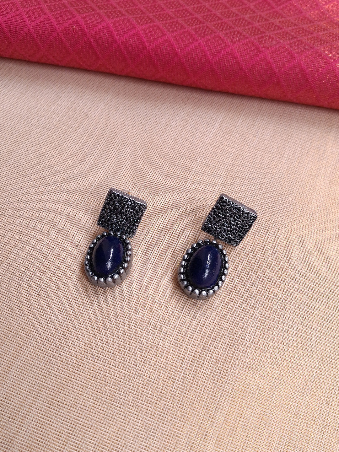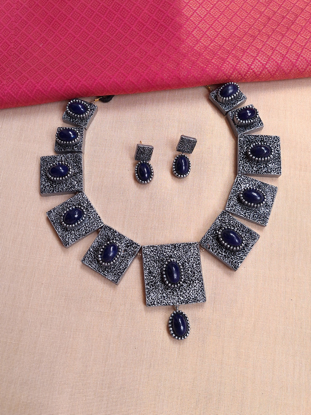 Home Terracotta Metallic Black and Blue Geometric Statement Necklace Set with Earrings