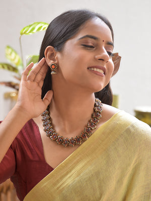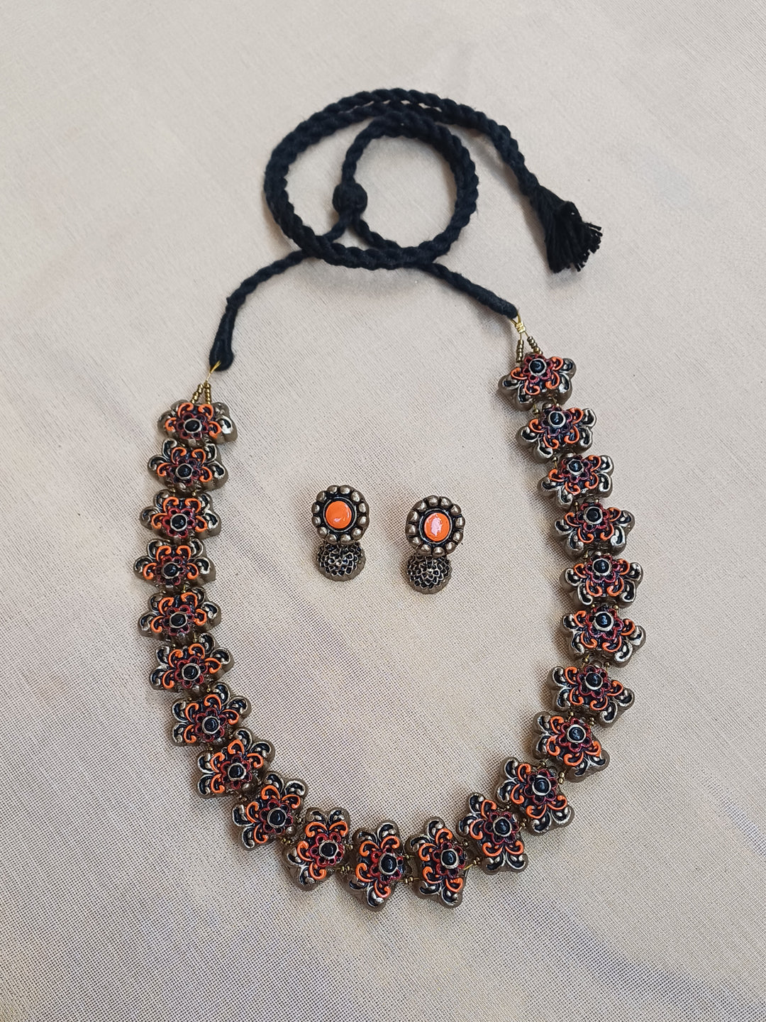 Home Terracotta Orange Floral Bead Necklace with Antique Black Accents & Earrings