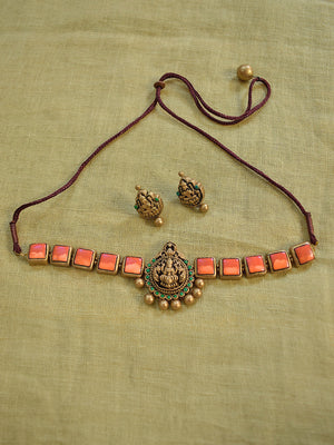 Home Terracotta Orange Square Stone Choker Necklace with Lakshmi Goddess Pendant & Earrings