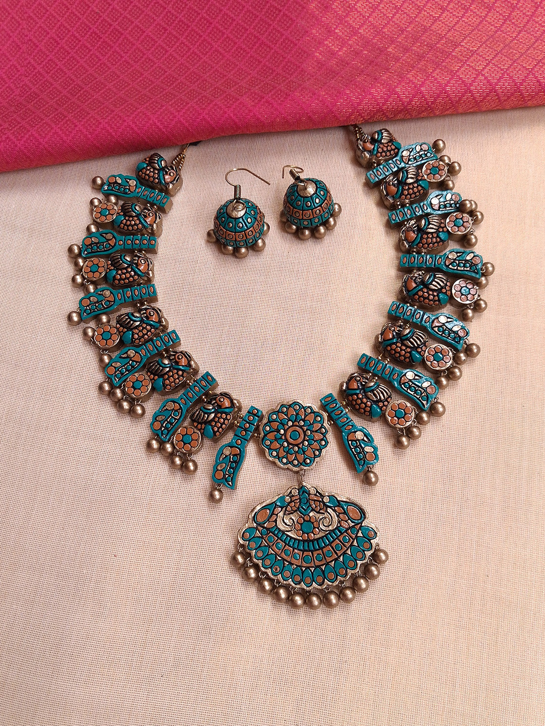 Terracotta Peacock Motif Turquoise and Copper Statement Necklace Set with Earrings