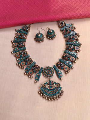 Home Terracotta Peacock Motif Turquoise and Copper Statement Necklace Set with Earrings