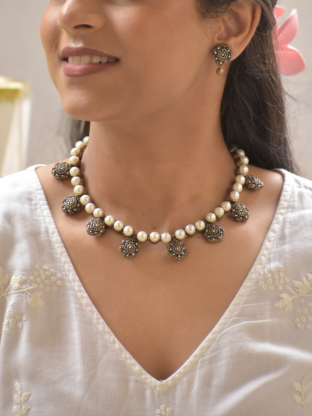 Terracotta Pearl Drop Necklace Set with Antique Gold Floral Embellishments Stud Earrings