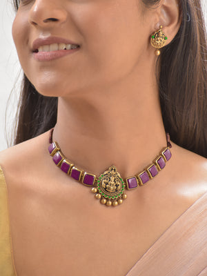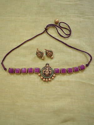 Terracotta Pink Square Stone Choker Necklace with Lakshmi Goddess Motif & Earrings