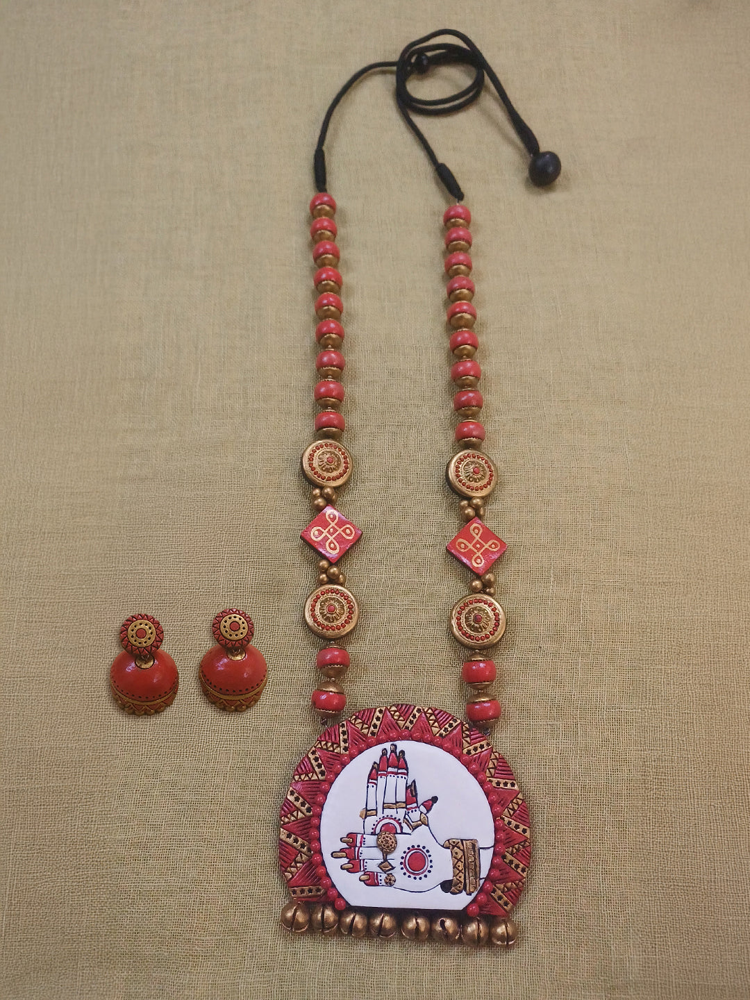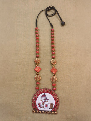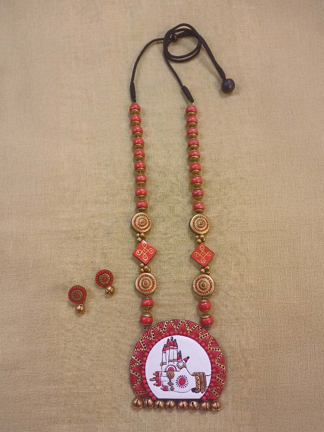 Select Style_No Earring (Only Necklace) | Terracotta Red Beaded Necklace with Hand-Painted Tribal Village Pendant