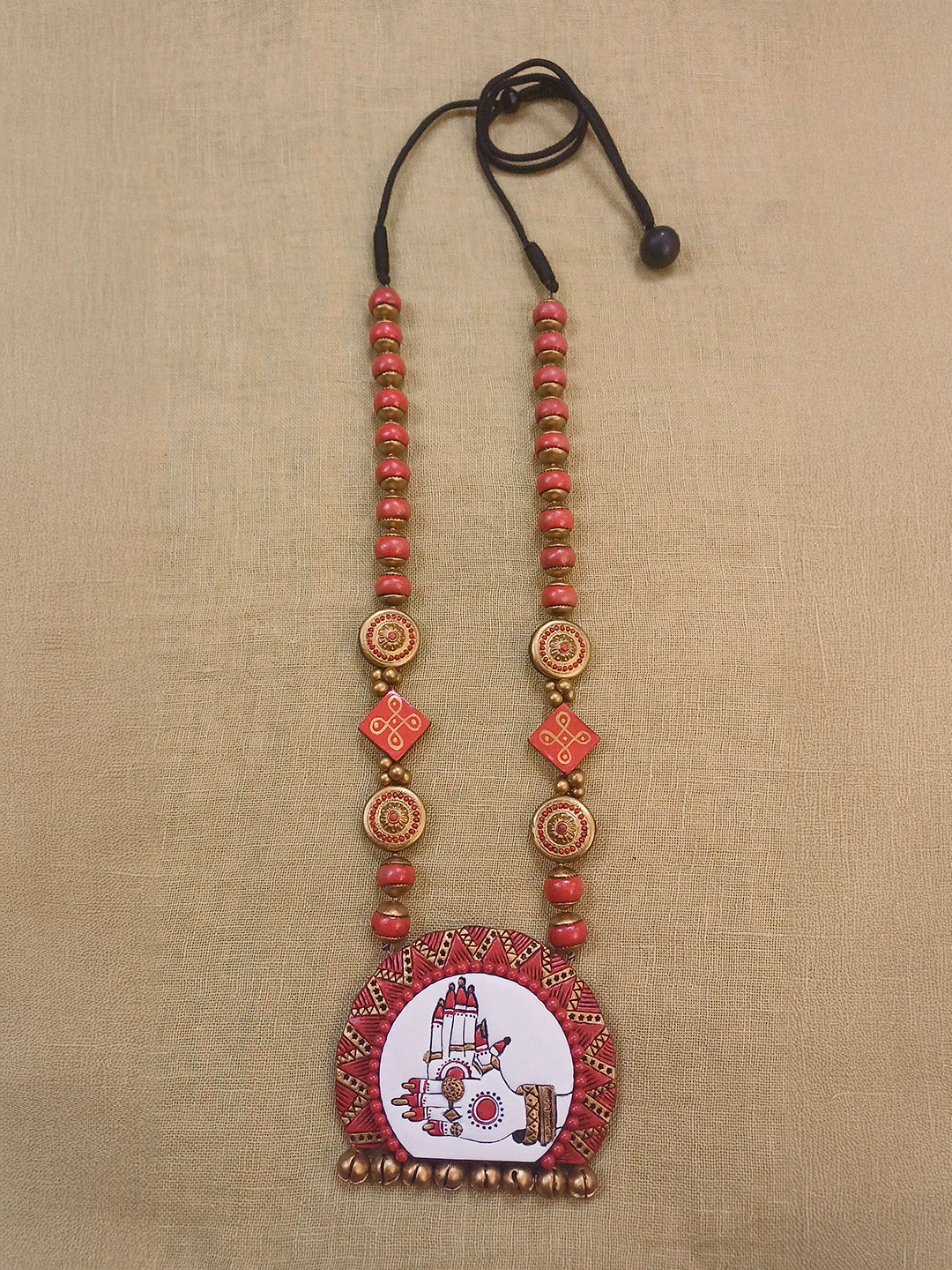Select Style_Jhumka | Terracotta Red Beaded Necklace with Hand-Painted Tribal Village Pendant