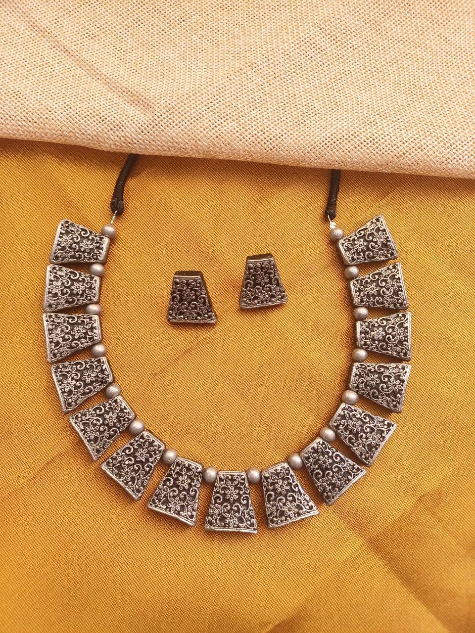 Terracotta Silver-Finish Floral Panel Necklace Set