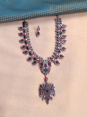 Home Terracotta Silver-Toned Necklace with Red and Green Paisley Motifs with earrings