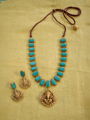 Terracotta Turquoise Oval Bead Necklace with Ganesha Pendant & Earrings
