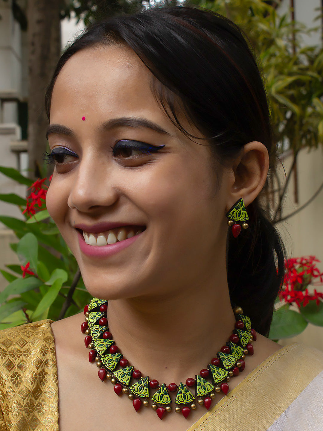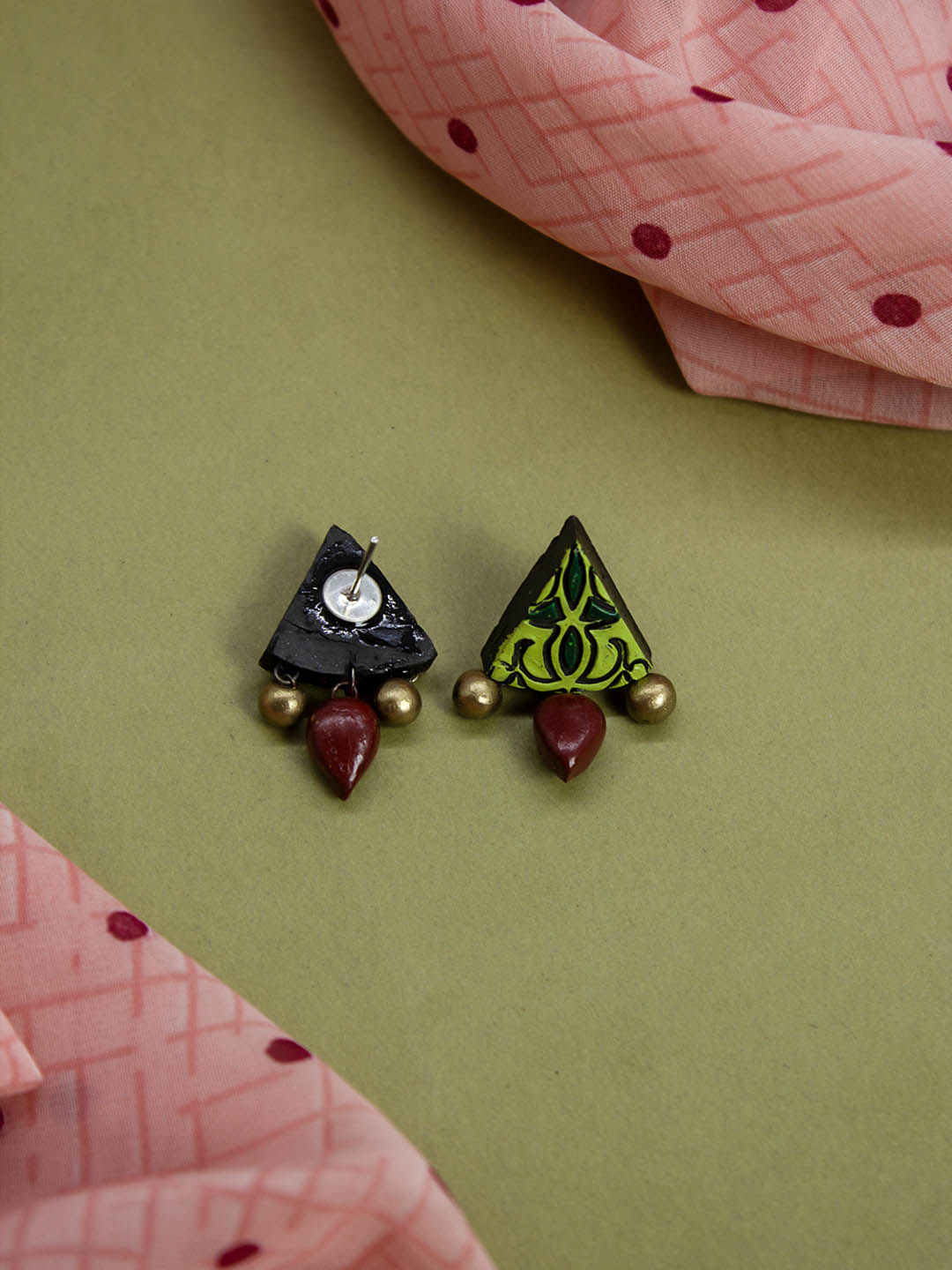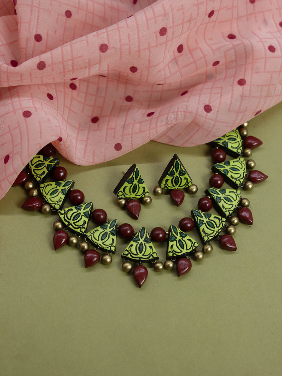 Triangular Design Antique Gold Light Green and Sap Green Handmade Terracotta Necklace Set