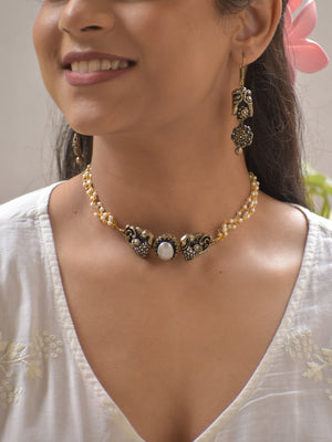 Home Twin Peacock Terracotta Necklace Set with White Stone & Beaded Strings – Antique Gold Finish