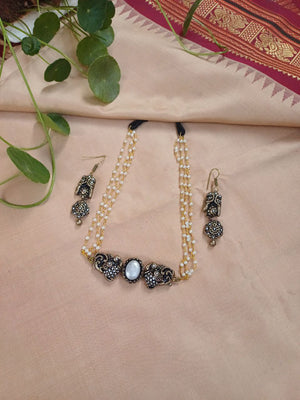 Twin Peacock Terracotta Necklace Set with White Stone & Beaded Strings – Antique Gold Finish