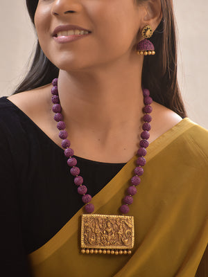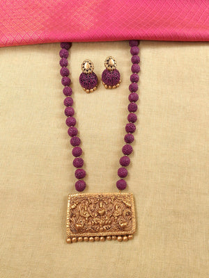 Home Vishwakanti – Handmade Terracotta Lakshmi Necklace Set with Purple Beads and Antique Gold Temple Pendant