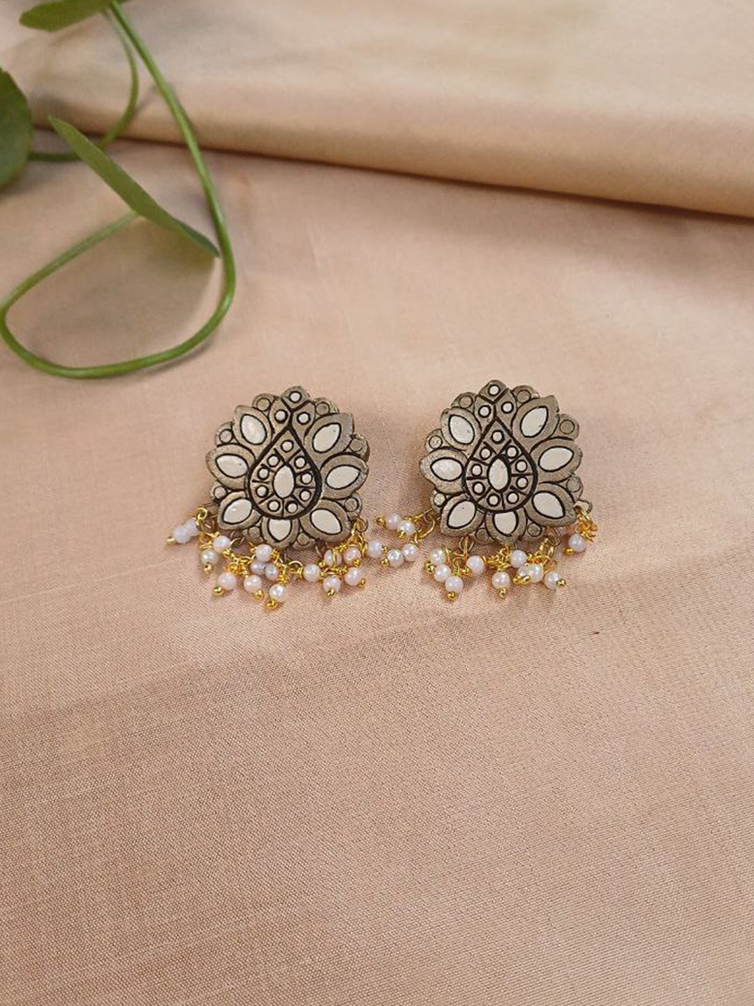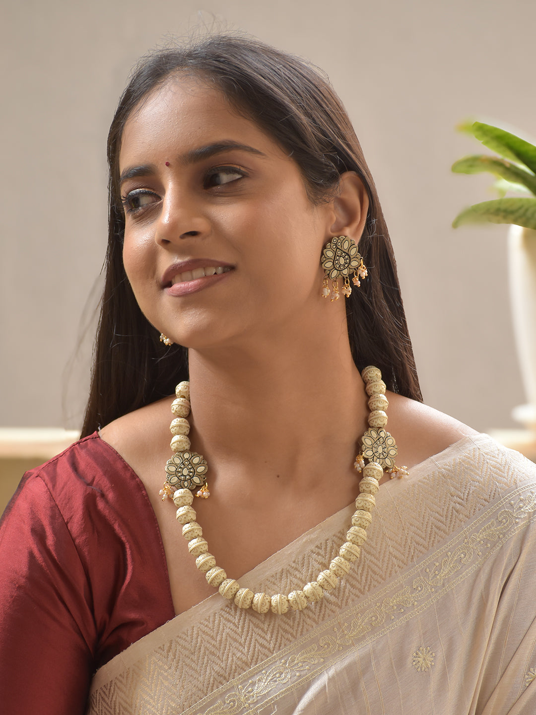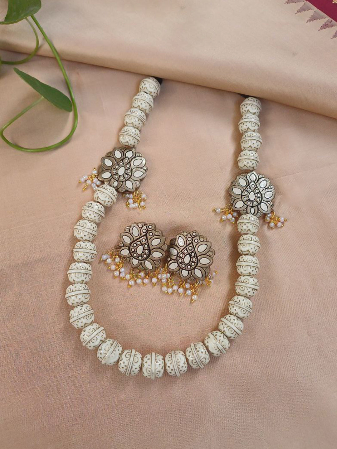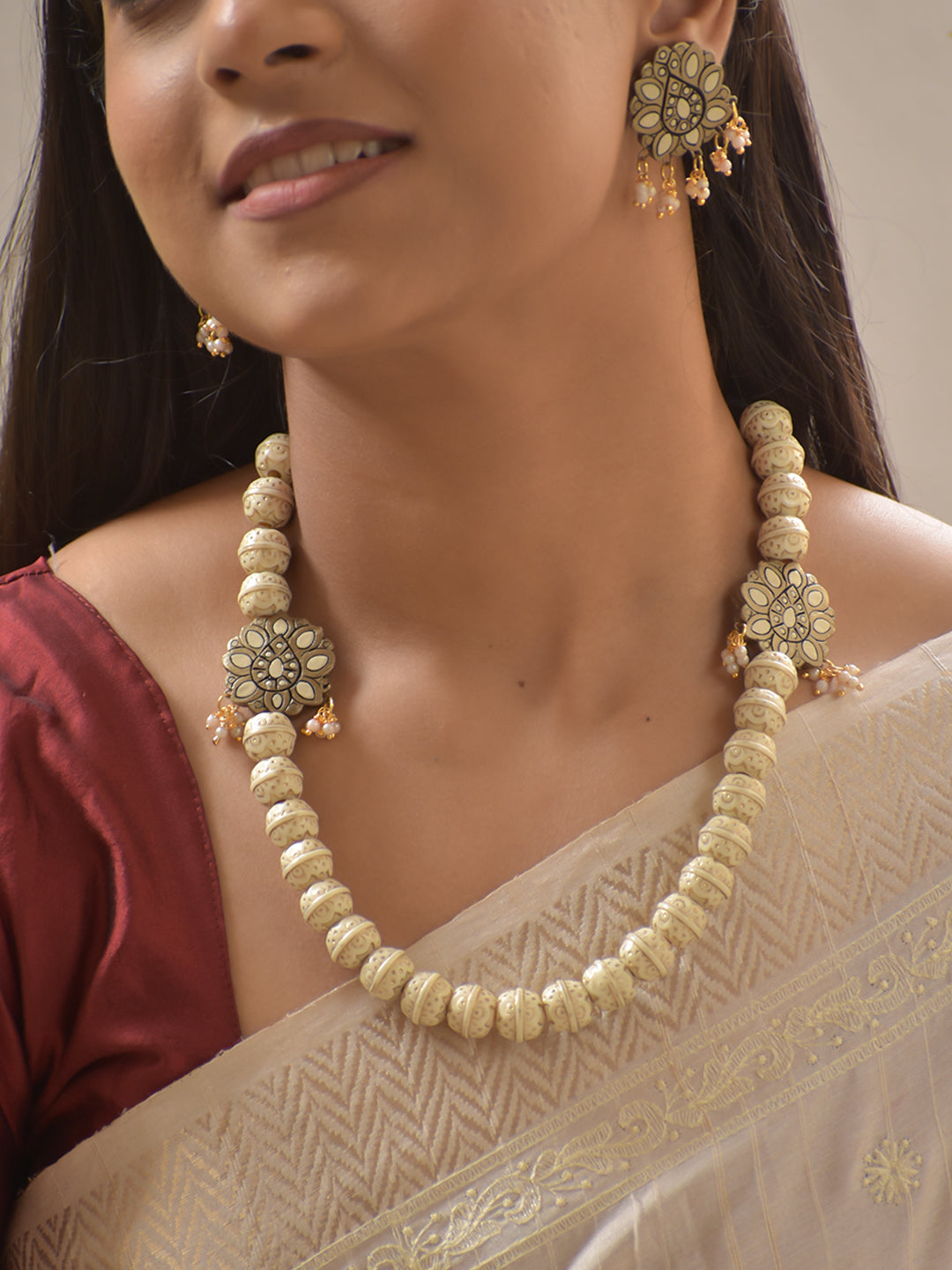 White Beads Terracotta Necklace Set with Floral Motifs – Antique Cream & Gold Beadwork Stud Earrings